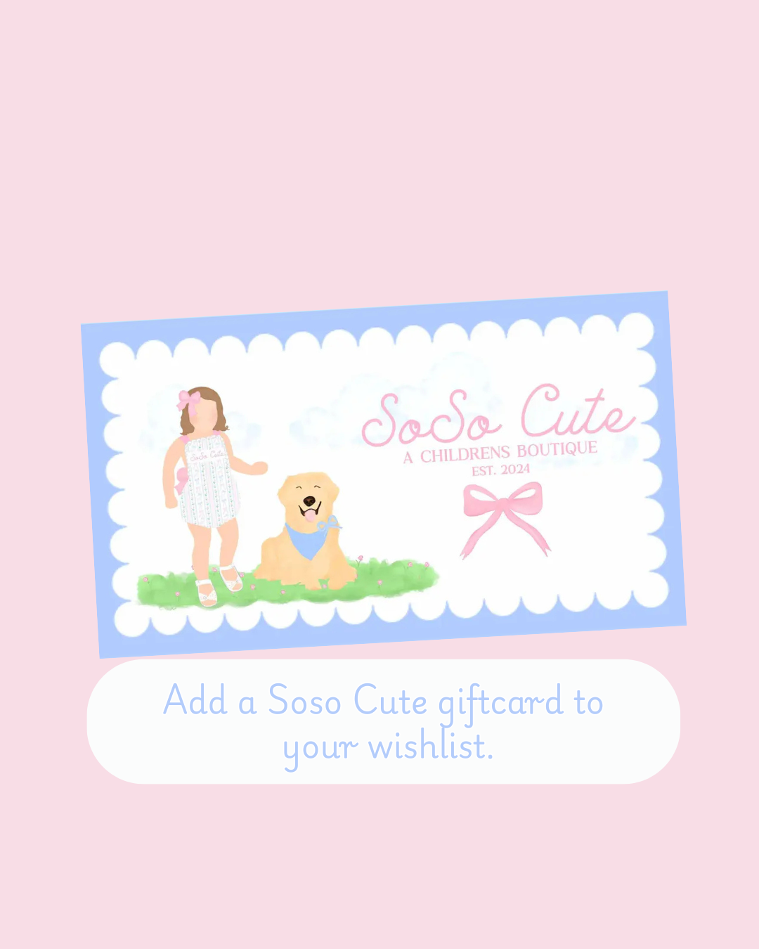 Not sure what to pick? Let them choose their favorites! Add a SoSo Cute Gift Card to your little one’s wishlist today — perfect for any occasion.
