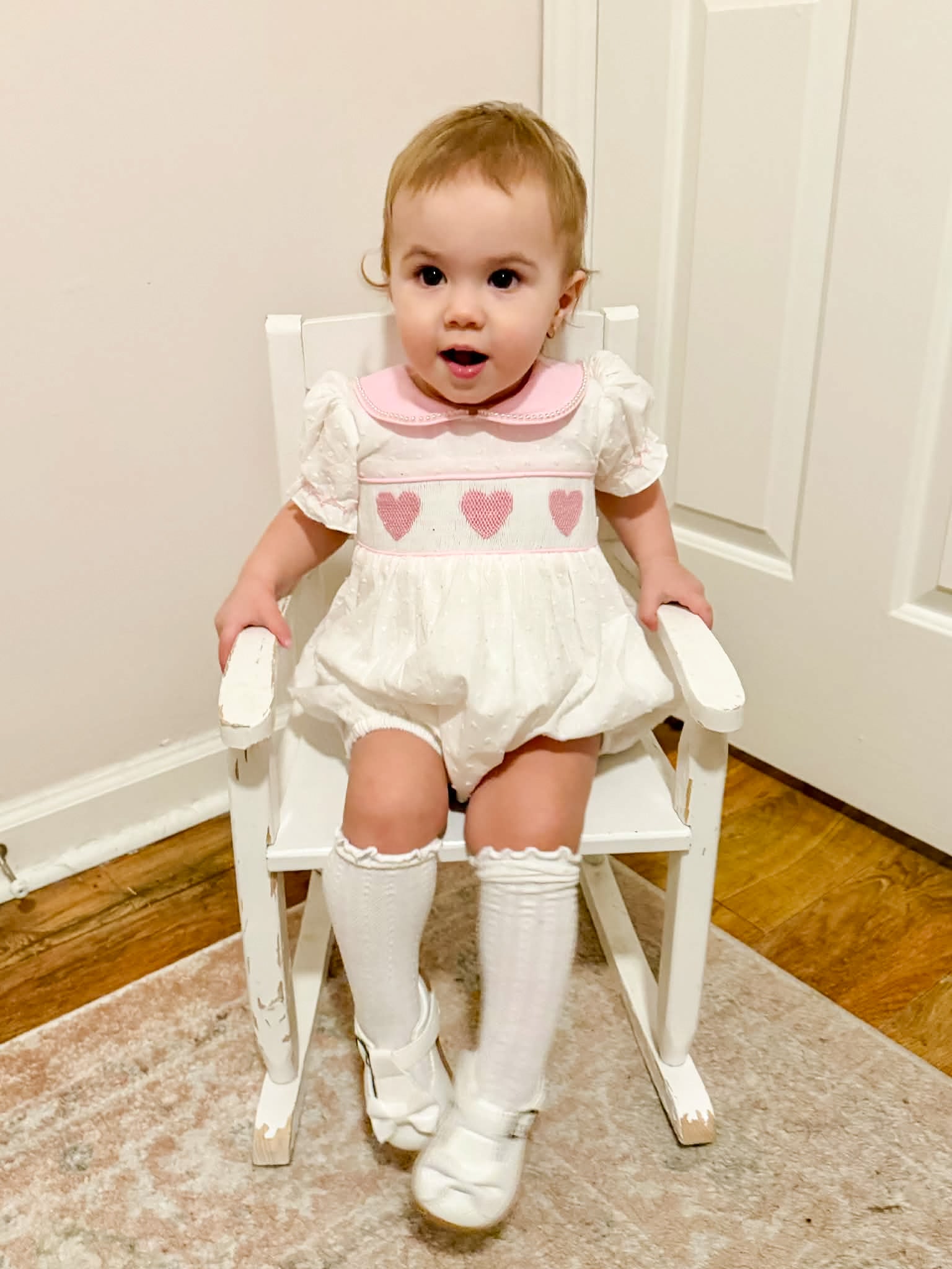 White Swiss dot bubble with hand smocking. Features a Peter Pan collar outlined with pearls and a tie-back bow embroidered in French knot with So so Cute.