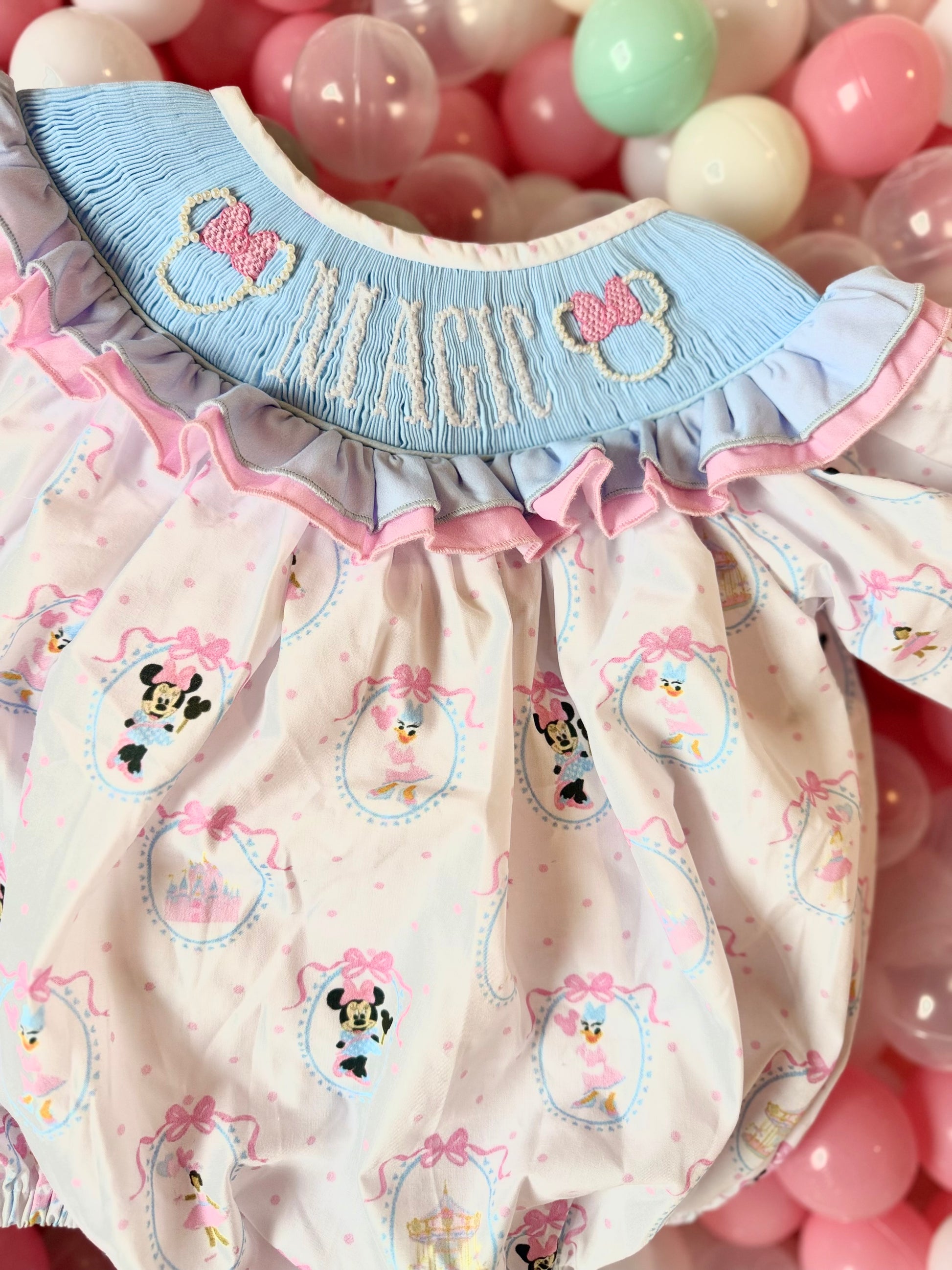 Hand-smocked diaper set featuring an exclusive pattend,Woven material , and a customizable smock plate where you can add the name of your choice. pearl details